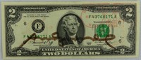 20 - ANDY WARHOL SIGNED $2 BILL w SOUP CAN ILLUSTRATION Two Dollar Bill post marked 1979 signed Andy Warhol to front with soup can marker drawing to verso. Measures 6 1/8" x 2 1/2".