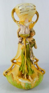 22 - ROYAL DUX STYLE FIGURAL PORCELAIN VASE Royal Dux style porcelain vase with female figure holding a large flower. Measures 16 1/2" h x 10" w x 9" d.
