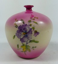 24 - ROYAL BONN PINK FLORAL PORCELAIN SQUAT VASE Royal Bonn pink floral porcelain squat vase. Marked to underside. Measures 4 5/8" h x 4 1/8" x 4 1/8".