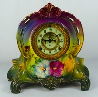 27 - ANSONIA LA RIVIERE ROYAL BONN MANTLE CLOCK Ansonia Clock Company enamel face clock. 'La Riviere' with Royal Bonn porcelain case. Floral motif throughout. Marked to face of clock and marked to back of porcelain case. Measures 12 5/8" h x 13 1/2" l x 5 3/4" d.