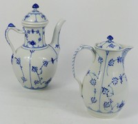 33 - 2pc ROYAL COPENHAGEN BLUE FLUTED COFFEE & PITCHER Two pieces of Royal Copenhagen porcelain in the Blue Fluted pattern. Includes covered coffee pot and covered pitcher. Each marked to underside and to lid. Largest measures 9 3/4" x 7 1/4" x 5".