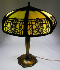 35 - EMPIRE LAMP CO 8 PANEL SLAG GLASS TABLE LAMP Empire Lamp & Brass Manufacturing Company 'Morning Glory' metal overlay slag glass table lamp. Measures 23" h x 18" x 17 1/2".