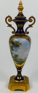 36 - FRENCH SEVRES STYLE GILT METAL MOUNTED COBALT URN French Sevres style cobalt porcelain urn with gilt metal mounts. Marked to underside. Measures 13 1/2" x 4 1/2" x 3 1/2".