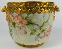 37 - LIMOGES FRENCH GILT & FLORAL PORCELAIN JARDINIERE Limoges gilt and floral porcelain handled jardiniere. Signed C.E. Ingalls 1893 to underside. Measures 9 3/4" x 6 3/4" h x 8" d.