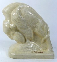38 - LOUIS FONTINELLE FRENCH CERAMIC BISON SCULPTURE Louis Fontinelle French crackle glazed ceramic bison sculpture. Signed to base. Measures 7" h x 7" l x 2 3/4" d.