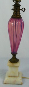 42 - MID-CENTURY MURANO GLASS & MARBLE LAMP Mid-century Murano glass lamp with marble base in the manner of Barovier and Toso. Glass measures 9 1/2" height. Lamp measures 31" x 14 3/4" x 14 3/4" overall with shade.