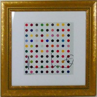 47 - DAMIEN HIRST 'AMINICHLOROBENZOPHENONE' LITHO Damien Hirst signed offset lithograph titled Aminochlorobenzophenone. Hand signed in black marker. Viewable measures 8 1/8" x 7 5/8. Frame measures 15 1/8" x 15 1/8" x 1".
