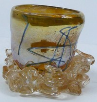 49 - STEUBEN AURENE THREADED ART GLASS BOWL Steuben Aurene art glass cup or bowl having threaded decoration to body and freeform rope design to base. Signed to underside. Measures 4" x 3 3/4" x 3" height.