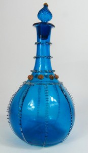 50 - VENETIAN BLUE GLASS DECANTER Venetian blue glass decanter with stopper. Decorated with gold flowers and colorless ribbed design. Measures 12 3/8" x 6 1/4" x 6 1/4".