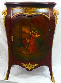 7 - 19th C VERNIS MARTIN KINGWOOD HAND PAINTED CABINET Louis XV style Meuble D'Appui Side Cabinet constructed with Kingwood veneer. Hand painted with classical romantic scenes to door, sides and top. Gilt ormolu mounts. Raised on cabriole legs with sabots. Interior fitted with two wooden shelves. Locking mechanism on door with key. Measures 46" h x 32 1/2" w x 17 3/4" d.