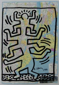 9 - KEITH HARING INK DRAWING ON NEW YORK CITY MAP Ink drawing depicting a totem figure on New York City map attributed to Keith Haring. Signed and dated 1988 lower right. Sheet measures 37 3/8" x 25".