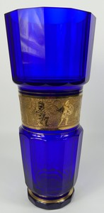 10 - LARGE MOSER COBALT & GILT GLASS VASE Large Moser cobalt glass vase decorated with a gilt band featuring warriors. Measures 14 1/2" height.