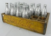 15 - ANDY WARHOL 'YOU'RE IN' PAINTED COCA COLA BOTTLES 18 Andy Warhol spray painted Coca Cola glass bottles. Two bottles initialed to cap. Includes a vintage Coca Cola crate signed to side in black marker. Each bottle measures 7 3/4" x 2 1/4". Crate measures 18 1/4" x 12".