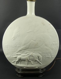 24 - GEORGE CLAXTON EQUESTRIAN PORCELAIN VASE LAMP George Claxton (American, 1947-1994) equine porcelain vase depicting horses. Impressed G. Claxton and numbered 68/100. Hand signed. Porcelain measures 15 1/2" x 13 1/4". Lamp measures 28" overall height.