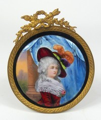 26 - ANTIQUE FRENCH ENAMEL PORTRAIT PLAQUE French enamel portrait plaque in gilt frame. Plaque measures 3 5/8" diameter. Frame measures 5 1/4" height.