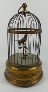 28 - ANTIQUE FRENCH AUTOMATON SIGNING BIRD IN CAGE Antique French singing bird in case automaton music box in working order. Marked Made In France to underside. Numbered 132 to edge of base. Measures 11" height x 6" diameter.