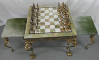30 - PIERO BENZONI GILT BRONZE, SILVER & ONYX CHESS SET Piero Benzoni Gilt Bronze, Silver-Plate and Onyx Chess Set with thirty-two gilt bronze and silver-plate chess pieces. Each piece measures 4" to 4 1/2" height and is signed Piero Benzoni. Chess table measures 25" x 25" x 21 1/2" height. Each stool measures 15" x 15" x 17 1/2" height. Note: onyx table top has been repaired.
