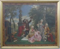 3 - FELIX SCHURIG ANTIQUE OIL PAINTING ON CANVAS Felix Schurig (German, 1852-1907) oil painting on canvas depicting a drinking party in the garden. Signed lower left. Viewable measures 54 1/2" x 42 1/2". Frame measures 57 3/4" x 45 3/4".