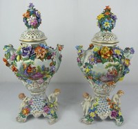 41 - PR DRESDEN FLORAL CHERUB PORCELAIN URNS Pair of Dresden porcelain floral encrusted handled urns. Each with two putti to base. Each holds SP Dresden mark to underside and measures 19" height x 9" width.