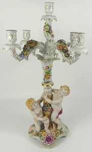 43 - VON SHIERHOLZ 5-ARM PORCELAIN CANDELABRA Von Schierholz German porcelain candelabra having two putti at base and applied flowers throughout. Marked to underside. Measures 22 1/2" h x 14" w.