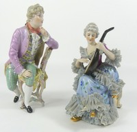 45 - 2pc DRESDEN PORCELAIN FIGURINES Two Dresden porcelain figurines. Seated lady with lace dress and mandolin marked MZ Germany. Seated gentleman with unidentified mark, numbered 2409. Man measures 7" height.