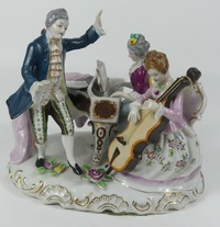 49 - DRESDEN STYLE FIGURAL PORCELAIN ORCHESTA GROUP Dresden style figural porcelain group. Depicts a pianist, cellist and conductor. Unmarked. Measures 9" x 7 1/2" h.