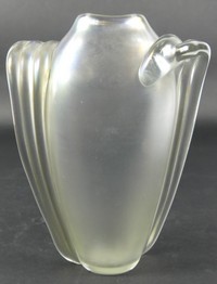 50 - FENTON IRIDESCENT ART GLASS VASE Iridescent studio glass vase with applied ribbed decoration. Unsigned, likely Fenton. Measures 6 1/4" h x 5 1/8" w.