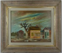 7 - AARON BOHROD 'STREET SCENE' OIL PAINTING ON BOARD Aaron Bohrod (American, 1907-1992) oil painting on board depicting a street scene with figure and bicycle. Signed lower left. Viewable measures 19 1/4" x 15 1/2". Frame measures 29 1/2" x 25 3/4". Provenance: Purchased from Oehlschlaeger Gallery, Chicago in 1964.