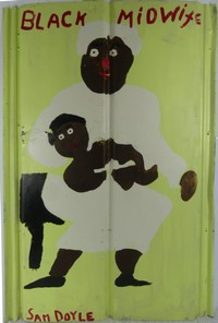 10 - SAM DOYLE 'BLACK MIDWIFE' PAINTING ON METAL Paint on found rusted metal depicting a standing figure with child attributed to Sam Doyle (American, 1906-1985). Titled along upper edge. Signed lower left. Measures 40 1/4" x 26 3/4".