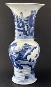 14 - CHINESE BLUE & WHITE PORCELAIN PHOENIX TAIL VASE Chinese blue and white porcelain vase of phoenix tail form depicting a landscape with river. Measures 17 1/2" height x 9" diameter.