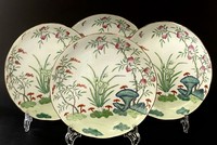 15 - 4pc CHINESE FAMILLE ROSE PORCELAIN DISHES Four Chinese Famille Rose porcelain plates. Each depicts a landscape scene with peaches, lingzhi mushrooms, flowers and butterfly. Each marked to underside and measures 9" diameter.