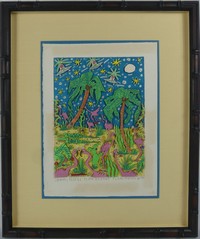 16 - JAMES RIZZI 'FLAMBOYANT FLAMINGOES' 3D SERIGRAPH James Rizzi 3D serigraph titled 'Flamboyant Flamingoes'. Pencil signed lower left. Titled lower center. Marked A/P and dated 1981 lower right. Measures 15 1/4" x 11". Frame measures 23 1/4" x 19".
