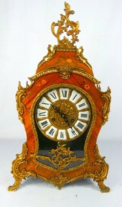 19 - FRANZ HERMLE GERMAN WOOD & BRASS MANTLE CLOCK French Louis XIV style German Franz Hermle Boulle and Marquetry mantel clock. Marked FHS to movement. Measures 22 1/4" x 13" x 5 1/2".