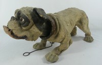 1 - 19th C FRENCH PAPIER MACHE NODDING BARKING DOG 19th Century French Nodding Barking Dog. Papier mache body with metal chain attached to the neck, the feet with wood wheels. Measures 21" x 9 1/2" x 8".