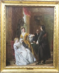 20 - WILLIAM FRITH 'THE LOVE TOKEN' OIL ON PANEL William Frith (British, 1819-1909) oil painting on board. Titled 'The Love Token.' A scene from Walter Scott's 'The Bride of Lammermoor.' Multiple exhibition labels to verso. Measures 17 1/2" x 14". Frame measures 21 1/2" x 18".