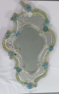 23 - VENETIAN GLASS MIRROR WITH BLUE FLOWERS Venetian glass mirror with blue flowers. Measures 38 1/2" x 23". Note: not in perfect condition.