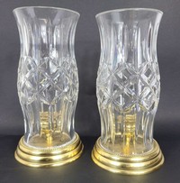 25 - PR WATERFORD CRYSTAL & BRASS HURRICANE LAMPS Pair of Waterford cut crystal and brass hurricane lamps / candle holders. Each marked to crystal and to underside of base. Each measures approx 10 1/2" height. Note: crystal shades appear to differ slightly in size.