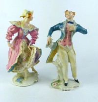 28 - 2pc KARL ENS GERMAN PORCELAIN DANCER FIGURINES Two Karl Ens Volkstedt porcelain figures of dancers. Each marked to underside. Largest measures 9 1/2" x 5 1/2" x 4 1/2".