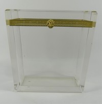 40 - ITALIAN HEAVY LUCITE LION HEAD MAGAZINE RACK Italian mid-century thick lucite magazine rack or trash can. Lion head with gilt metal decoration near rim. Measures 11" x 10 3/4".
