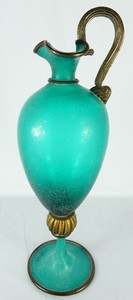 41 - MARIO POGGI MURANO SCAVO GLASS PITCHER Mario Poggi Scavo teal sea green and gold aventurine art glass pitcher. Signed to underside. Measures 21 1/2" height.