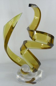 44 - SHLOMI HAZIZA GOLDEN FREEFORM ACRYLIC SCULPTURE Shlomi Haziza abstract acrylic / lucite swirl sculpture with colorless sphere. Signed to base and holds original label. Measures 26 3/4" x 14".