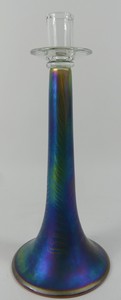 48 - IGOR MULLER PULLED FEATHER ART GLASS CANDLESTICK Igor Muller iridescent art glass candlestick holder with pulled feather design. Signed to underside. Measures 13" height.