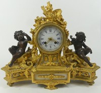 6 - RAINGO FRERES FRENCH GILT BRONZE MANTEL CLOCK Raingo Freres gilt and patinated bronze figural mantel clock. Marked Raingo Fres, A Paris. Includes pendulum and key. Measures 15 1/2" x 13 1/4".