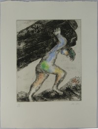 9 - MARC CHAGALL HAND COLORED BIBLE SERIES ETCHING Marc Chagall (Russian/French 1887-1985) etching with watercolor on wove paper. Titled 'Samson Carries off the Gates of Gaza' plate number 59 from the The Bible Etchings portfolio. Pencil signed lower right and numbered 23/100 lower left. Sheet measures 17 1/2" x 13 1/8".
