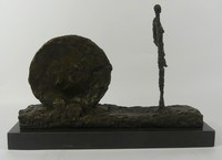 17 - ALBERTO GIACOMETTI 'FEMME AVEC ROUE' BRONZE Bronze sculpture titled 'Woman with Wheel' after Alberto Giacometti. Signed to bronze base. Measures 13 3/4" length x 10" height.