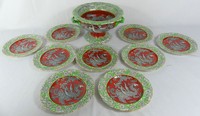 18 - 10pc MASONS IRONSTONE DRAGON CHINA SET Ten piece of antique Mason's Ironstone. Each piece decorated with a dragon over an orange ground with foliate border. Each marked to underside. Includes 9 plates each measuring 8 1/4" and footed double handled bowl-10 3/4" x 6 3/4".