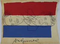 21 - ANDY WARHOL 'ELECTION NIGHT' SIGNED INVITATION Andy Warhol color offset lithograph depicting Ronald Reagan and Walter Mondale. Titled 'Election Night, 1984'. Hand signed to edge. Sheet measures 12 1/8" x 9 1/4".