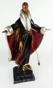 5 - ERTE 'FAUBOURG ST. HONORE' BRONZE SCULPTURE Romain De Tirtoff, Erte (Russian/French, 1892-1990) cold-painted bronze sculpture titled 'Faubourg St. Honore'. Signed to cape. Numbered 46/375, dated 1990 and marked Chalk & Vermilion and Sevenarts to base. Measures 19 1/2" height x 7 3/4" width.