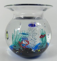 8 - ELIO RAFFAELI ARS MURANO GLASS FISH BOWL Murano ARS studio art glass sculpture by Elio Raffaeli (born 1936). Depicts a colorful Modernist encased glass aquarium fish bowl with marine sea life fish and plant forms. Signed to underside. Measures 8" x 8" x 8".