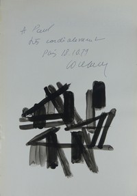 14 - PIERRE SOULAGES SIGNED BOOK w OIL PAINTING Pierre Soulages abstract composition oil painting on book page of 'Soulages Peintures Recentes' book. Dedicated to Paul, dated 1979 and signed upper center. Book measures 11 3/4" x 8 1/4".